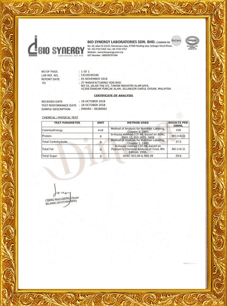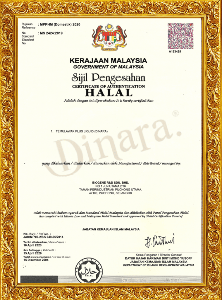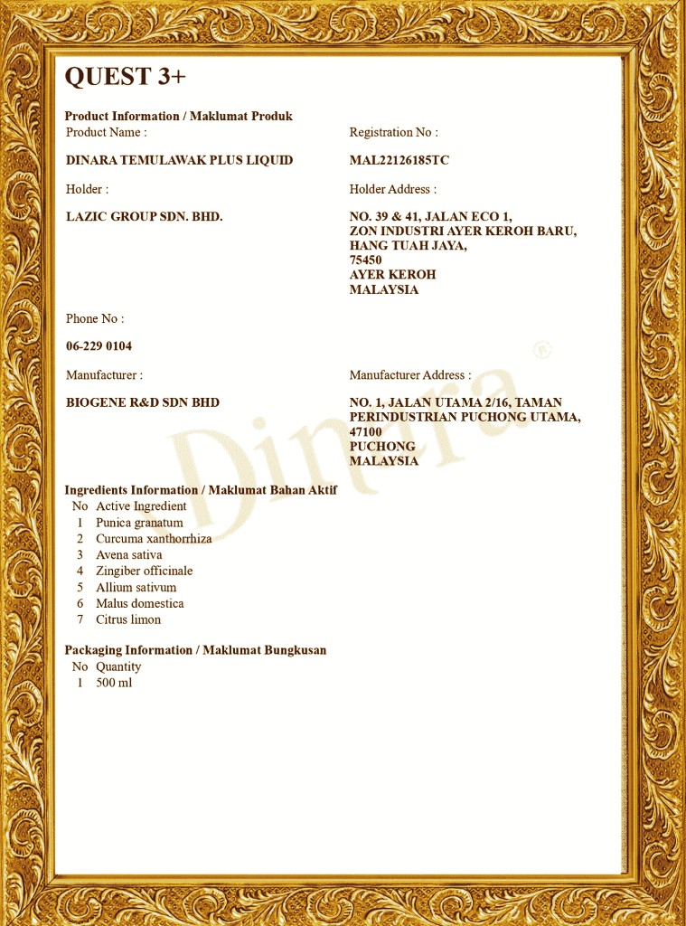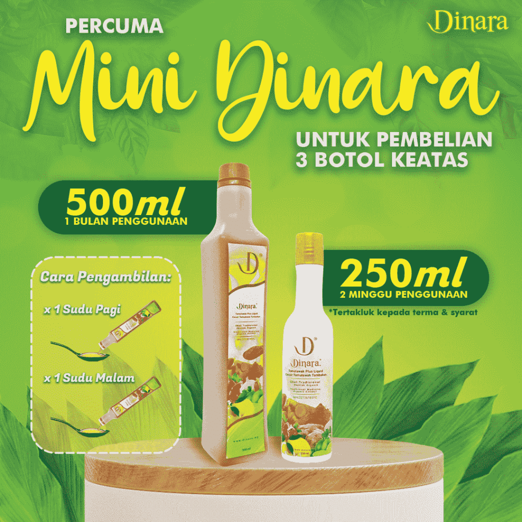Jus Dinara dirumus dengan gabungan temulawak, halia, lemon, delima, bawang putih, epal dan oat ramuan tradisional dan semula jadi yang menyokong amalan gaya hidup sihat.